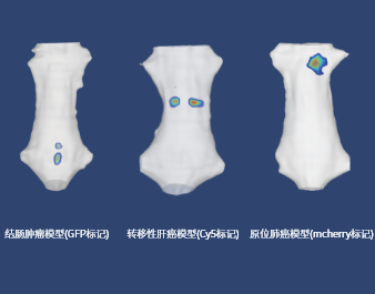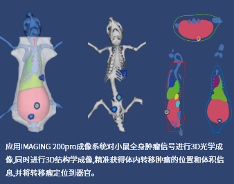 小鼠原位结肠癌:通过原位植入mcherry荧光蛋白标记的肿瘤细胞建立小鼠原位结肠癌模型,由于肠道的生理结构,模型中经常会出现多个肿瘤,应用二维成像时信号常发生互相覆盖的情况。IMAGING 200pro能有效地对原位肿瘤进行检测,运用先进的三维成像算法,在三维空间实现对肿瘤的准确定位,并量化肿瘤大小。