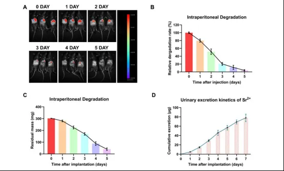 (A)S@NV-Sr/GC在不同时间点的体内成像;(B)其体内分布与降解的定量数据(n = 3);(C)不同时间点从植入部位取出残余S@NV-Sr/GC的质量测定结果,证实材料在腹腔内逐步降解(n = 3);(D)S@NV-Sr/GC植入后通过ICP-MS检测的Sr²⁺累积尿液排泄曲线,验证了Sr²⁺的时间依赖性释放及系统清除过程(n = 3)。所有数据均以mean ± SD表示。