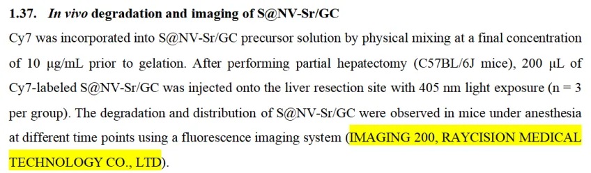 上海交通大学医学院附属仁济医院科研团队近日在学术期刊《Chemical Engineering Journal》(IF:13.2,中科院一区top期刊)发表论文,题为Mito-boosting nanovesicle hydrogel dressing rescues hepatocyte bioenergetic insufficiency and promotes post-hepatectomy regeneration(线粒体增强型纳米囊泡水凝胶敷料改善肝细胞能量不足并促进术后再生)。锐视科技的小动物活体成像系统(IMAGING 200)在研究中被用以评估水凝胶敷料在活体动物体内的降解特性。