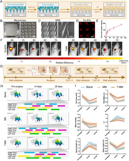 近日,南开大学、中国人民解放军总医院等多单位联合团队在国际权威期刊《Materials Today Bio》(IF=10.2;JCR 一区)发表题为《Turmeric-derived extracellular vesicles loaded microneedle system attenuates rotator cuff degeneration by orchestrating energetic metabolism》的研究成果。该团队成功研发出负载姜黄素来源细胞外囊泡(Tur-EVs)的微针系统(T-MN),通过调控腱干细胞 / 祖细胞(TSPCs)的能量代谢平衡,结合锐视科技 IMAGING 200 活体荧光成像系统的精准监测,为解决肩袖损伤修复效率低、术后再撕裂率高的临床难题提供了创新策略与潜在方案。
