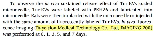 研究人员构建大鼠肩袖损伤模型,将 PKH26 荧光标记的 Tur-EVs 负载于微针中,植入损伤部位,同时设置直接注射 Tur-EVs 对照组。术后 0、1、3、5、7 天通过锐视医疗 IMAGING 200 活体荧光成像系统进行全身荧光成像,精准捕捉 Tur-EVs 在损伤部位的荧光信号强度与分布范围,量化分析其体内滞留时间与释放效率。
