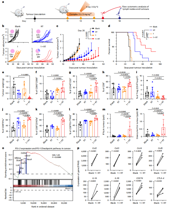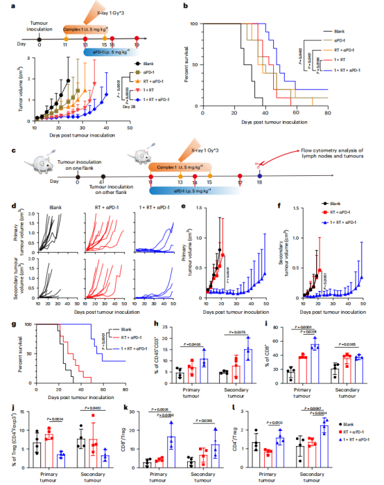 1、精准剂量递送,保障机制验证:为CT26结肠癌细胞、4T1乳腺癌细胞的体外放疗及小鼠肿瘤模型体内照射,实现20 Gy精准X射线递送,剂量误差小于±1%,成功触发Complex 1向铂氮烯转化,确保实验结果准确可重复。2、低剂量适配性,赋能联合治疗:精准输出1 Gy低剂量X射线,配合Complex 1与PD-1抑制剂,规避高剂量放疗毒副作用的同时,有效激活抗肿瘤免疫,使双侧肿瘤完全消退率达40%,远优于传统放疗方案。3、一体化设计,提升研究效率:集成放疗与定量光学断层扫描功能,可实时监测肿瘤照射与生长状态,减少操作误差,高效获取肿瘤生长曲线、免疫细胞浸润分析等关键数据,大幅加快研究进程。在SHARP 1000的技术支持下,该研究取得多项突破性成果:在CT26结肠癌、4T1乳腺癌及原位胶质母细胞瘤模型中,该联合方案均表现出强效抗肿瘤效果,70%小鼠实现肿瘤完全消退,且形成长期免疫记忆;相比传统铂类药物,该方案对小鼠主要器官无明显损伤,安全性优异;同时对缺氧肿瘤、转移性肿瘤均有效,为多种实体瘤治疗提供新方向。图3:肿瘤生长抑制与生存曲线验证图