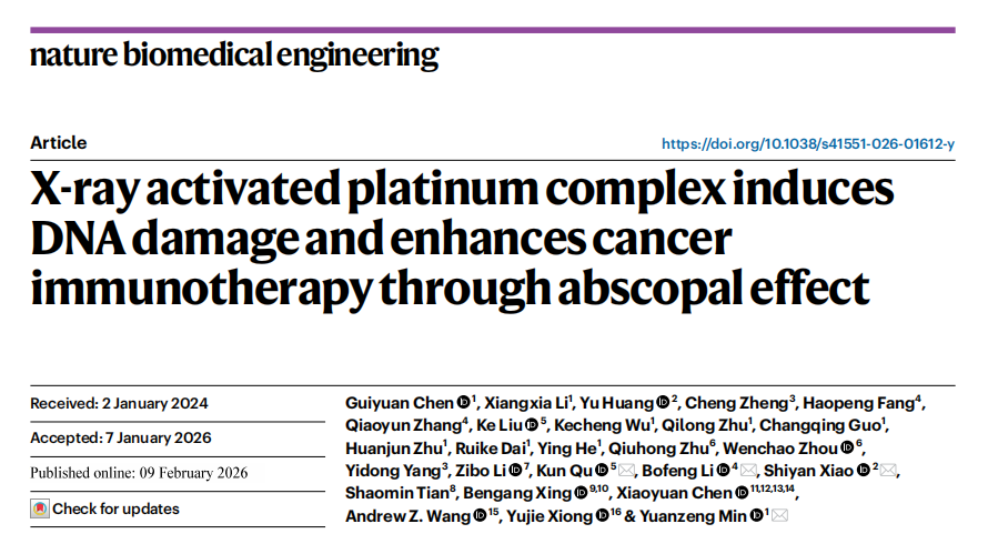 近日,中国科学技术大学闵元增/肖石燕/李博峰/瞿昆在《Nature Biomedical Engineering》——Nature大子刊、生物医学工程领域TOP 1%旗舰期刊(一区,IF=39.2),发表了一项颠覆性癌症治疗研究:新型铂类配合物(Complex 1)联合低剂量放疗与免疫检查点抑制剂,实现40%小鼠双侧肿瘤完全消退,破解了传统放疗对远隔转移肿瘤疗效不佳的行业难题。锐视科技SHARP 1000多模态图像引导的精准放疗系统作为研究核心放疗设备,以高精度X射线照射技术全程保障实验数据可靠,成为这项顶刊成果的关键技术支撑。